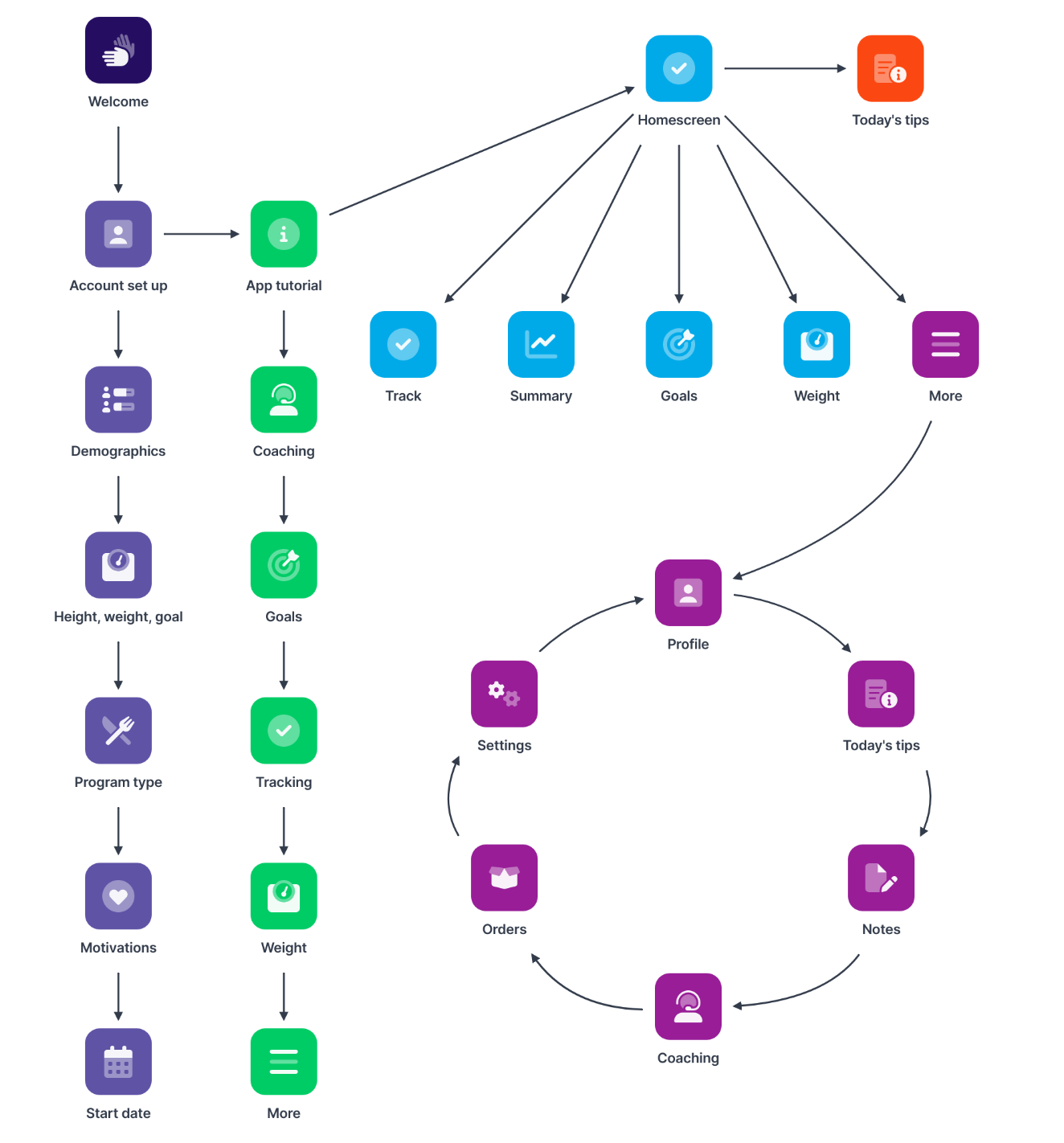 This all-in-one diet and exercise tracker now connected all of our online resources to one platform giving both clinic‐based and at‐home members access to new digital content. Members could track program behaviors, get feedback, set goals, and receive targeted coaching to help them achieve their weight‐loss goals. Coaches received streamlined data to personalize the member experience. Furthermore, data aggregation would help refine the program's delivery to improve member compliance. This iOS and Android MVP was designed to allow for future enhancements and eventually full scale virtual coaching.